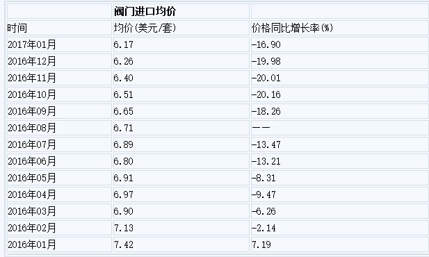 以下為2016年1月—2017年1月閥門進(jìn)口均價(jià)走勢(shì):